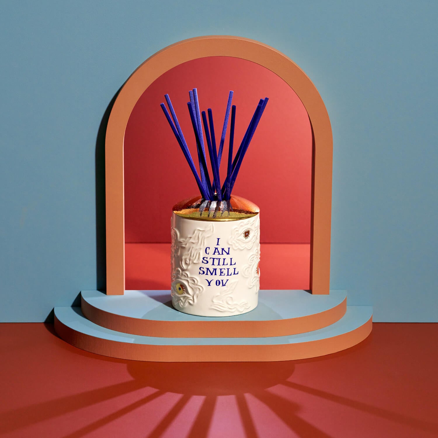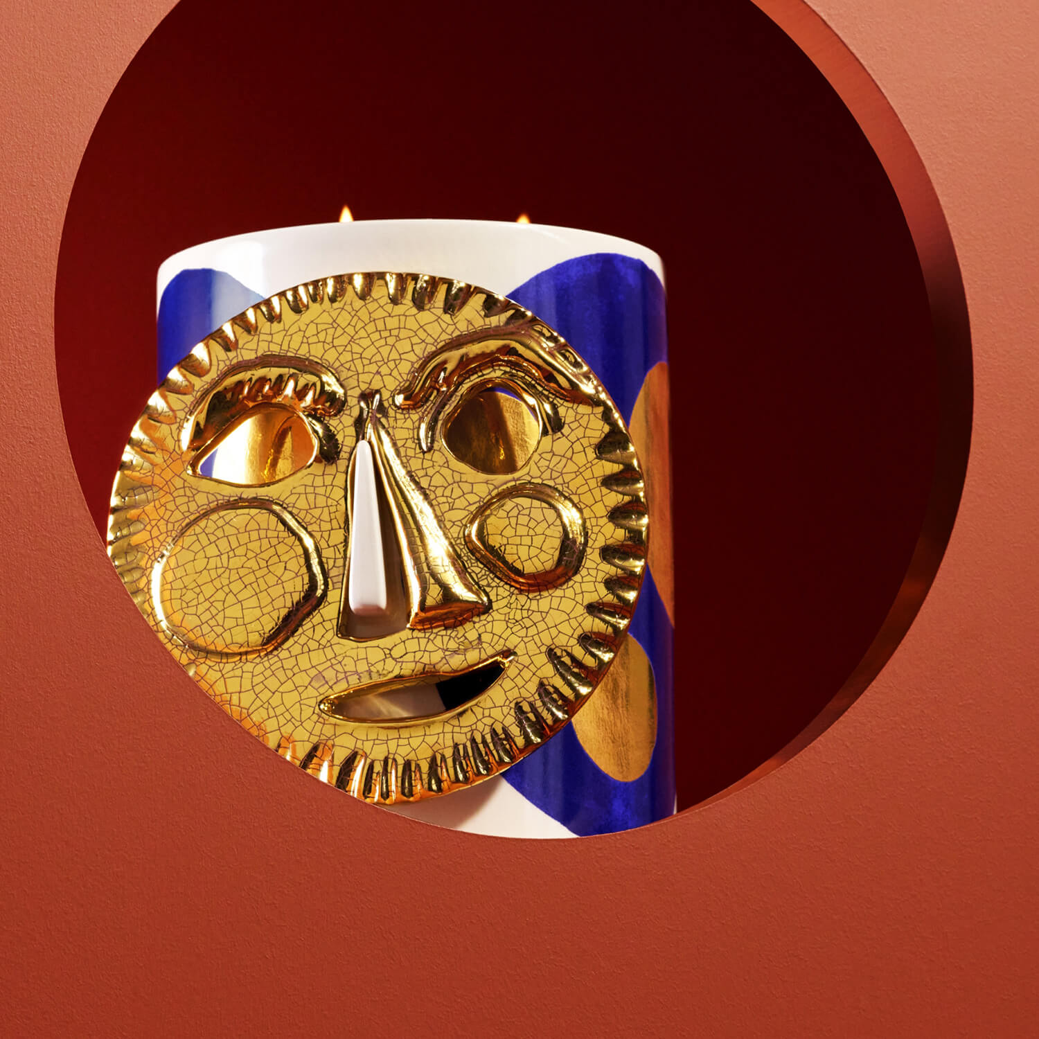 L'OBJET features its iconic veti-vert scent in the Ruan Hoffman collection. The BURNING DESIRE candle wraps the fragrance in a striking royal blue ribbon design with gold and platinum details. With its playful lid and intricate craftsmanship, the large MASK candle adds fun and elegance. The I CAN STILL SMELL YOU oil diffuser dazzles with it's gold-outlined smoky eye design.