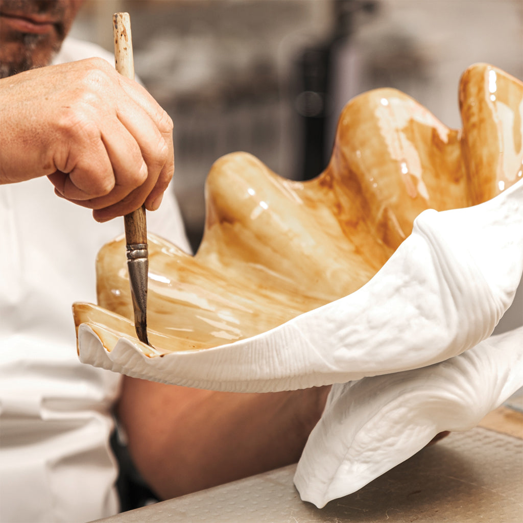 An exceptional decorative masterpiece from L'Objet Atelier Collection. The beauty of nature is always the most difficult to reproduce. L'Objet craftsmen demonstrate all their mastery in the work of fine porcelain and gold. Every detail of the shells is reproduced to perfection to create outstanding beauty. Suitable for food service or as a decorative vessel.