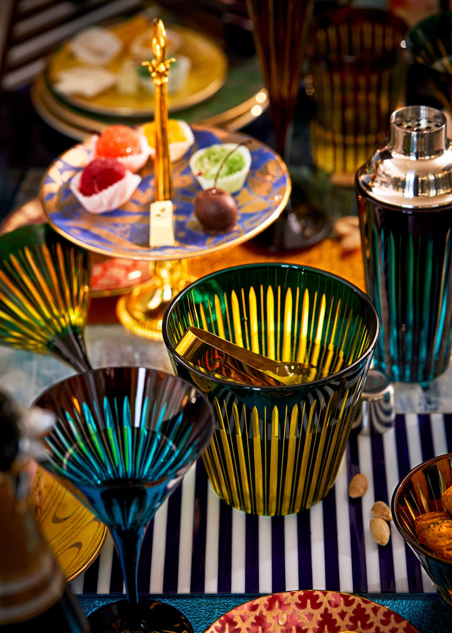 The PRISM collection now extends into a complete suite of barware, including flutes, shakers, decanters, ice buckets, and more. Each piece is crafted in luminous hand-cut glass and finished in rich tones. With bold geometry and a refined sense of proportion, every piece is designed to be both functional and visually striking.